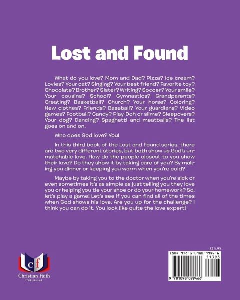What do you love? Mom and Dad? Pizza? Ice cream? Lovies? Your cat? Singing? Your best friend? Favorite toy? Chocolate? Brother? Sister? Writing? Soccer? Your smile? Your cousins? School? Gymnastics? Grandparents? Creating? Basketball? Church? Your horse? Coloring? New clothes? Friends? Baseball? Your guardians? Video games? Football? Candy? Play-Doh or slime? Sleepovers? Your dog? Dancing? Spaghetti and meatballs? The list goes on and on. Who does God love? You! In this third book of the Lost and Found series, there are two very different stories, but both show us God's unmatchable love. How do the people closest to you show their love? Do they show it by taking care of you? By making you dinner or keeping you warm when you're cold? Maybe by taking you to the doctor when you're sick or even sometimes it's as simple as just telling you they love you or helping you tie your shoe or do your homework? So, let's play a game! Let's see if you can find all of the times when God shows his love. Are you up for the challenge? I think you can do it. You look like quite the love expert!