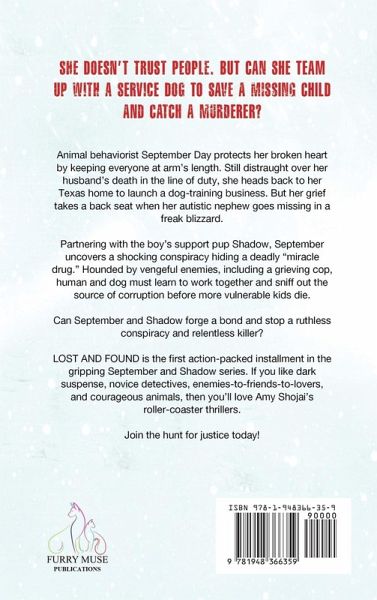 Explosive debut! "Riveting, heart-wrenching, and brilliant..." -James Rollins, New York Times bestselling author She doesn't trust people. But can she team up with a service dog to save a missing child and catch a murderer? Animal behaviorist September Day protects her broken heart by keeping everyone at arm's length. Still distraught over her husband's death in the line of duty, she heads back to her Texas home to launch a dog-training business. But her grief takes a back seat when her autistic nephew goes missing in a freak blizzard. Partnering with the boy's support pup Shadow, September uncovers a shocking conspiracy hiding a deadly "miracle drug." Hounded by vengeful enemies, including a grieving cop, human and dog must learn to work together and sniff out the source of corruption before more vulnerable kids die. Can September and Shadow forge a bond and stop a ruthless conspiracy and relentless killer? LOST AND FOUND is the first action-packed installment in the gripping September and Shadow series. If you like dark suspense, novice detectives, enemies-to-friends-to-lovers, and courageous animals, then you'll love Amy Shojai's roller-coaster thrillers. Buy LOST AND FOUND to join the hunt for justice today!