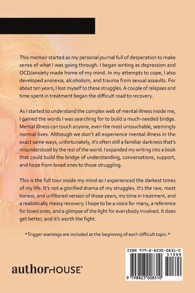 This memoir started as my personal journal full of desperation to make sense of what I was going through. I began writing as depression and OCD/anxiety made home of my mind. In my attempts to cope, I also developed anorexia, alcoholism, and trauma from sexual assaults. For about ten years, I lost myself to these struggles. A couple of relapses and time spent in treatment began the difficult road to recovery. As I started to understand the complex web of mental illness inside me, I gained the words I was searching for to build a much-needed bridge. Mental illness can touch anyone, even the most untouchable, seemingly normal lives. Although we don't all experience mental illness in the exact same ways, unfortunately, it's often still a familiar darkness that's misunderstood by the rest of the world. I expanded my writing into a book that could build the bridge of understanding, conversations, support, and hope from loved ones to those struggling. This is the full tour inside my mind as I experienced the darkest times of my life. It's not a glorified drama of my struggles. It's the raw, most honest, and unfiltered version of those years, my time in treatment, and a realistically messy recovery. I hope to be a voice for many, a reference for loved ones, and a glimpse of the light for everybody involved. It does get better, and it's worth the fight. *Trigger warnings are included at the beginning of each difficult topic.*