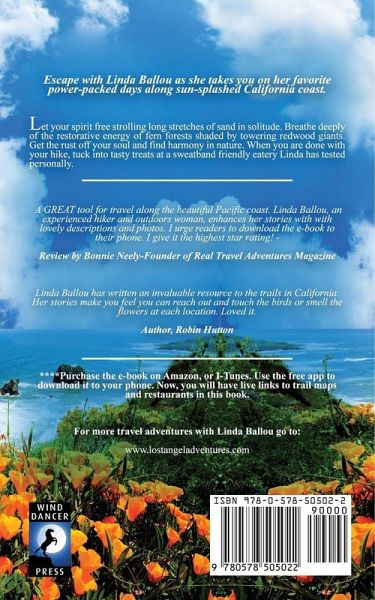 Escape with Linda Ballou as she takes you on her favorite power-packed outdoor days along the sun-splashed California. Let your spirit free strolling long stretches of sand in solitude. Breathe deeply of the restorative energy of fern forests shaded by towering redwood giants. Get the rust off your soul and find harmony in nature. When you are done with your hike, tuck into tasty treats at a sweatband friendly eatery Linda has tested personally. A GREAT tool for travel along the beautiful Pacific coast. Linda Ballou, an experienced hiker and outdoors woman, enhances her stories with with lovely descriptions and photos. I urge readers to download the e-book to their phone. I give it the highest star rating! Review by Bonnie Neely-Founder of Real Travel Adventures Magazine Linda Ballou has written an invaluable resource to the trails in California. Her stories make you feel you can reach out and touch the birds or smell the flowers at each location. Loved it. Author, Robin Hutton ****Purchase the e-book on Amazon, or I-Tunes. Use the free ap to download it to you phone. Now, you will have live links to trail maps and restaurants in this book. ****For more travel adventures with Linda Ballou go to www.lostangeladventures.com