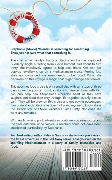 Stephanie (Stevie) Valentini is searching for something. She's just not sure what that something is. The chef in her family's trattoria, Stephanie's life has imploded. Suddenly single, suffering from Covid burnout, and about to turn thirty, she impulsively agrees to help best friend Kim with her pop-up jewellery shop on a Mediterranean cruise. Feeling lost, she's not convinced she even needs to be found. What she discovers on this voyage is magic that might change her forever. This gourmet food cruise is on a small ship with ten stops of three days in exciting ports from Barcelona to Venice. Time with Kim can only help heal Stephanie's wounded heart as they have laughed and cried their way through life together as only besties can. They will be crew on this cruise and not paying passengers. Kim understands Stephanie does not want anyone to know she is the TikTok star of Stevie Valentini's Pasta Party. Nor does she want any romance. With each passing port, adventures continue, surprises occur and the final outcome once Venice is reached could not have been anticipated, particularly by Stephanie. Join bestselling author Patricia Sands as she whisks you away in the latest adventure in the Sail Away series. Lose yourself on the sparkling Mediterranean in a story of family, friendship and food.