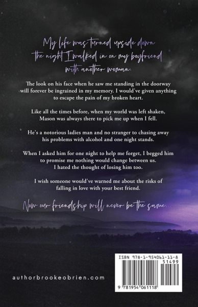 USA Today Bestselling author Brooke O'Brien brings all the steam in this small town meets city, friends-to-lovers romance. My life was turned upside down the night I walked in on my boyfriend with another woman. The look on his face when he saw me standing in the doorway will forever be ingrained in my memory. I would've given anything to escape the pain of my broken heart. Like all the times before, when my world was left shaken, Mason was always there to pick me up when I fell. He's a notorious ladies man and no stranger to chasing away his problems with alcohol and one night stands. When I asked him for one night to help me forget, I begged him to promise me nothing would change between us. I hated the thought of losing him too. I wish someone would've warned me about the risks of falling in love with your best friend. Now our friendship will never be the same...