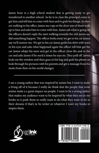 BOOK SUMMARY/SYNOPSIS: James Seno is a high school student that is getting ready to get transferred to another school. As he is in class the principal come to get him and tell him to come with him and to grab his things. As they are walking to his office, James see cops at the door one of them walk up to him and asks him to come with him. James ask what is going on the officers doesn't reply the start walking towards the exit James say did something happen. The officer looks away we get to his car James say we'll answer me. We get to his car James grabs his shirt with tears in his eyes and asks what happened again the officer tell him get the car James whips his tears and get in the officer close the and in the car and asks James if he need a tissue he says no. They pull off. James look out the window and then goes in his bag and grab his phone an look through his pictures with his parents and get a message from his mom from then on his world changes ABOUT THE AUTHOR: I am a young author that was inspired by anime but I want to make a living off of it because I really do think that the people that write anime make a a great impact on people. I want to be a young author that makes my audience want to be inspired by what they see in my books so it push them to really want to do what they want to do in their dreams if that's to be writer or whatever I want my books to inspire them.