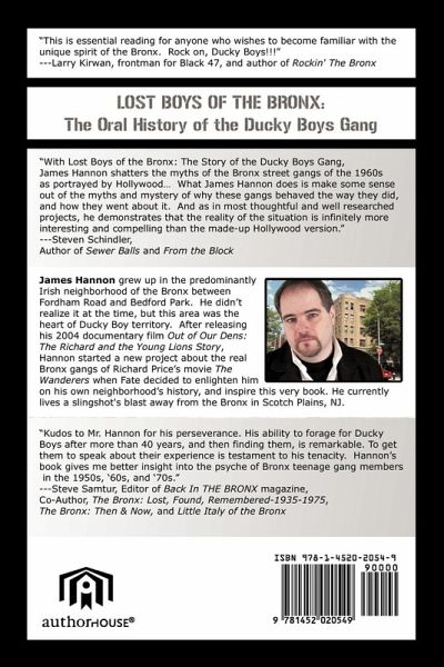 Straight from the streets of the mid-1960s Bronx comes a book about one of the borough's most feared gangs - The Ducky Boys. While their unusual name alone might contradict their reputation, in the Norwood/Bainbridge section of the Bronx their appearances provoked an ominous dread. So much so, that when Richard Price needed inspiration for a terrifying gang in his novel (and later movie) The Wanderers, he knew exactly which gang to choose. Lost Boys of the Bronx tells the story of the Ducky Boys in their own words. It is a story of how a few pre-teen kids in the Botanical Gardens turned into a gang of hundreds - and a gang so alarming that rumors of their arrival would shut down local schools. This is also a study of the mostly Irish Bronx neighborhood in which the Ducky Boys were born, and where so many of the Ducky kids got caught up in the tumultuous times of the '60s where their fierce loyalty was the only thing that got them through. This is not your typical gang book. It neither praises nor demonizes the gang for the things they did, but rather simply reports what happened - warts and all. You'll see the truth behind the Ducky Boys' gang - their lives, their loves, their pranks and crimes, and so much more. To borrow from a particular product's slogan - with a name like the Ducky Boys, you knew they HAD to be tough.