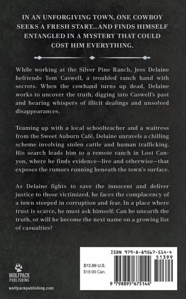 In an unforgiving town, one cowboy seeks a fresh start...and finds himself entangled in a mystery that could cost him everything. While working at the Silver Pine Ranch, Jess Delaine befriends Tom Caswell, a troubled ranch hand with secrets. When the cowhand turns up dead, Delaine works to uncover the truth, digging into Caswell's past and hearing whispers of illicit dealings and unsolved disappearances. Teaming up with a local schoolteacher and a waitress from the Sweet Auburn Café, Delaine unravels a chilling scheme involving stolen cattle and human trafficking. His search leads him to a remote ranch in Lost Canyon, where he finds evidence-live and otherwise-that exposes the rumors running beneath the town's surface. As Delaine fights to save the innocent and deliver justice to those victimized, he faces the complacency of a town steeped in corruption and fear. In a place where trust is scarce, he must ask himself: Can he unearth the truth, or will he become the next name on a growing list of casualties?