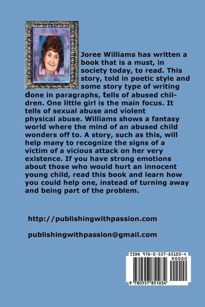 In the hopes that some child or children somewhere will be helped that this book was written. Joree has had a horrendous childhood. Where other people do and have not made it, Williams has. It is sometimes thought, that occurrences such as Joree has experienced, only could have taken place in a movie. The story unfolds the beginning of a very young child, a baby's life, and relives her growth. You will explore the fantasy places an abused child creates in her own mind to help herself not face reality. There is an explanation of poetic styles included. If you have strong emotions about those who would hurt an innocent child, read this book. We must learn to step in and report when we suspect there is child molestation going on.
