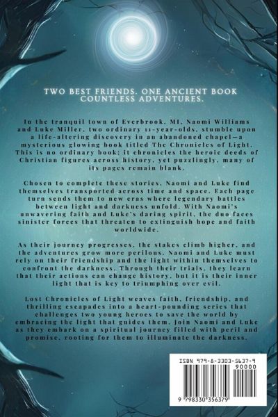 Two best friends. One ancient book. Countless adventures. In the tranquil town of Everbrook, MI, Naomi Williams and Luke Miller, two ordinary 11-year-olds, stumble upon a life-altering discovery in an abandoned chapel-a mysterious glowing book titled The Chronicles of Light. This is no ordinary book; it chronicles the heroic deeds of Christian figures across history, yet puzzlingly, many of its pages remain blank. Chosen to complete these stories, Naomi and Luke find themselves transported across time and space. Each page turn sends them to new eras where legendary battles between light and darkness unfold. With Naomi's unwavering faith and Luke's daring spirit, the duo faces sinister forces that threaten to extinguish hope and faith worldwide. As their journey progresses, the stakes climb higher, and the adventures grow more perilous. Naomi and Luke must rely on their friendship and the light within themselves to confront the darkness. Through their trials, they learn that their actions can change history, but it is their inner light that is key to triumphing over evil. Lost Chronicles of Light weaves faith, friendship, and thrilling escapades into a heart-pounding series that challenges two young heroes to save the world by embracing the light that guides them. Join Naomi and Luke as they embark on a spiritual journey filled with peril and promise, rooting for them to illuminate the darkness.