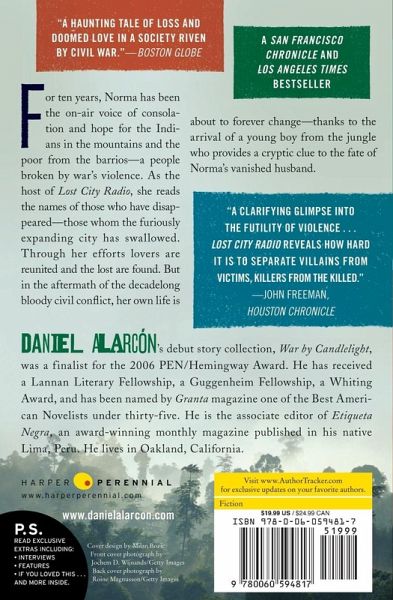 "Daniel Alarcon writes about subterfuge, lies, and the arbitrary recreation of history with a masterful clarity. By accepting the premise that war is senseless, he goes on to make sense of the lives that are destroyed in its wake. Lost City Radio is both ambitious and resonant." -- Ann Patchett, bestselling author of Bel Canto and The Dutch House In his critically acclaimed debut novel, award winning author Daniel Alarcón vividly portrays an anonymous nation searching for its identity at the end of a war with no clear right or wrong. For ten years, Norma has been the on-air voice of consolation and hope for the Indians in the mountains and the poor from the barrios--a people broken by war's violence. As the host of Lost City Radio, she reads the names of those who have disappeared--those whom the furiously expanding city has swallowed. Through her efforts lovers are reunited and the lost are found. But in the aftermath of the decade long bloody civil conflict, her own life is about to forever change--thanks to the arrival of a young boy from the jungle who provides a cryptic clue to the fate of Norma's vanished husband. Stunning, timely, and absolutely mesmerizing, Lost City Radio probes the deepest questions of war and its meaning: from its devastating impact on society to the emotional scarring each survivor carries for years after.