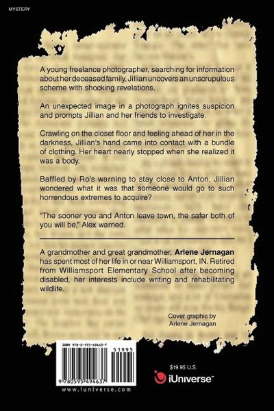 A young freelance photographer, searching for information about her deceased family, Jillian uncovers an unscrupulous scheme with shocking revelations. An unexpected image in a photograph ignites suspicion and prompts Jillian and her friends to investigate. Crawling on the closet floor and feeling ahead of her in the darkness, Jillian's hand came into contact with a bundle of clothing. Her heart nearly stopped when she realized it was a body. Baffled by Ro's warning to stay close to Anton, Jillian wondered what it was that someone would go to such horrendous extremes to acquire? "The sooner you and Anton leave town, the safer both of you will be," Alex warned.