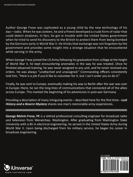 Author George Frese was captivated as a young child by the new technology of his day-radio. When he was sixteen, he and a friend developed a crude form of radar that could detect airplanes. In fact, he got in trouble with the United States government when he tried to send his discovery to the British to protect them from being bombed by the Germans early in World War II. He thinks that that exchange was not forgotten by the government and provides some insight into a strange situation that he encountered while serving in the army. When George Frese joined the US Army following his graduation from college at the height of World War II, he kept encountering anomalies in the way he was treated. Once he finished advanced training, he was never assigned to any unit, and he never received any orders. He was always "unattached and unassigned." Commanding officers consistently told him, "Here is a job if you'd like to volunteer for it, but I can't order you to do it." Finally, he was sent to Europe, eventually making his way to Berlin after the war was over in Europe; there, he ran the long lines of communications that connected all of the allies across Europe. This marked the beginning of his adventures in post-war Germany. Providing a description of many intriguing events-described here for the first time-Lost History and a Bizarre Mystery shares one man's memorable army experiences.