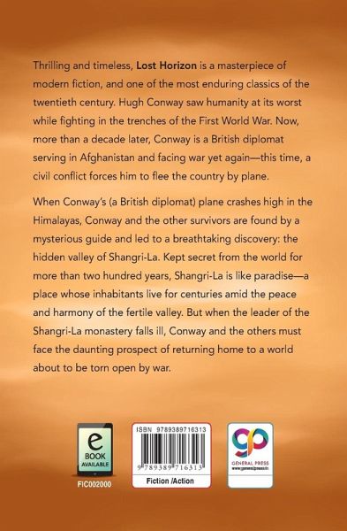 Thrilling and timeless, Lost Horizon is a masterpiece of modern fiction, and one of the most enduring classics of the twentieth century. Hugh Conway saw humanity at its worst while fighting in the trenches of the First World War. Now, more than a decade later, Conway is a British diplomat serving in Afghanistan and facing war yet again-this time, a civil conflict forces him to flee the country by plane. When Conway's (a British diplomat) plane crashes high in the Himalayas, Conway and the other survivors are found by a mysterious guide and led to a breathtaking discovery: the hidden valley of Shangri-La. Kept secret from the world for more than two hundred years, Shangri-La is like paradise-a place whose inhabitants live for centuries amid the peace and harmony of the fertile valley. But when the leader of the Shangri-La monastery falls ill, Conway and the others must face the daunting prospect of returning home to a world about to be torn open by war.