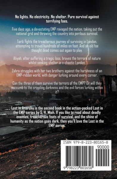 No lights. No electricity. No shelter. Pure survival against terrifying foes. Five days ago, a devastating EMP ravaged the nation, taking out the national grid and throwing the country into perilous survival. Tarik fights the treacherous journey of surviving in London, attempting to travel hundreds of miles on foot. And an old foe thought dead comes out again to play. Aliyah, after suffering a tragic loss, braves the terrors of nature whilst seeking shelter in a chaotic London. Zahra struggles with her two brothers against the harshness of an EMP-ridden world, with danger lurking around every corner. Can the three of them survive the terrors of the EMP? Or will they succumb to the crippling darkness and the evil forces lurking within it? Lost in Anarchy is the second book in the action-packed Lost in the EMP series by S. H. Miah. If you like to read about deadly enemies, treacherous feats of survival, and the shine of humanity as the nation goes dark, then you'll love the Lost in the EMP series.