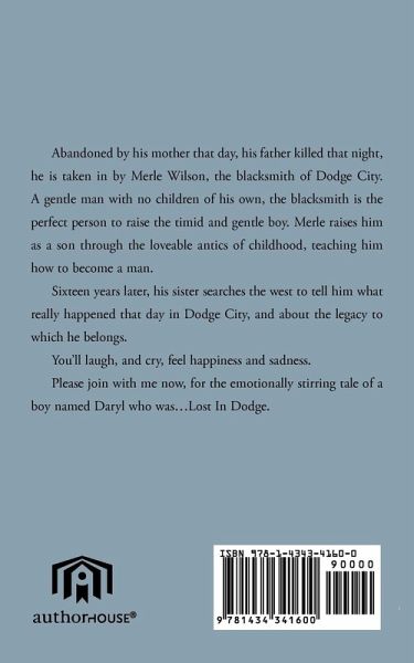 Lost In Dodge is placed in a western setting but isn't a true western book any more than Gone With The Wind is a war story. It's a book of love and tenderness, spiced with laughter, garnished with moments of sadness and a side dish of action. Lost In Dodge is about a young boy named Daryl who travels to Dodge City with his father, mother and little sister, Shelly Lynn. At the first available moment, his mother takes his sister and abandons him, taking the train to somewhere east. Later that night his father is killed, leaving him alone in a town he doesn't know. He's taken in by the kindly blacksmith Merle Wilson who, having no children of his own, raises Daryl through the loveable antics of childhood. Though Daryl tries to live the life of a normal boy, there is something about his appearance that registers shock in the eyes of those meeting him for the first time. Regardless, there is someone for everyone and he finds his love in Stephanie Rose. Together they build a life that is the envy of all. Sixteen years later Daryl's sister, Shelly Lynn, journeys west in search of her brother. At her mother's death bed she learned what really happened in Dodge City and has vowed to take that truth to the one who deserves it the most and also teach him of the lagacy to which he belongs. You'll laugh, you'll cry, feel happiness and sadness as you journey through this heartwarming tale of a boy named Daryl who was Lost In Dodge.