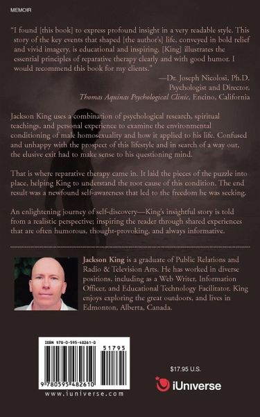"I found [this book] to express profound insight in a very readable style. This story of the key events that shaped [the author's] life, conveyed in bold relief and vivid imagery, is educational and inspiring. [King] illustrates the essential principles of reparative therapy clearly and with good humor. I would recommend this book for my clients." -Dr. Joseph Nicolosi, Ph.D. Psychologist and Director, Thomas Aquinas Psychological Clinic, Encino, California Jackson King uses a combination of psychological research, spiritual teachings, and personal experience to examine the environmental conditioning of male homosexuality and how it applied to his life. Confused and unhappy with the prospect of this lifestyle and in search of a way out, the elusive exit had to make sense to his questioning mind. That is where reparative therapy came in. It laid the pieces of the puzzle into place, helping King to understand the root cause of this condition. The end result was a newfound self-awareness that led to the freedom he was seeking. An enlightening journey of self-discovery-King's insightful story is told from a realistic perspective; inspiring the reader through shared experiences that are often humorous, thought-provoking, and always informative.