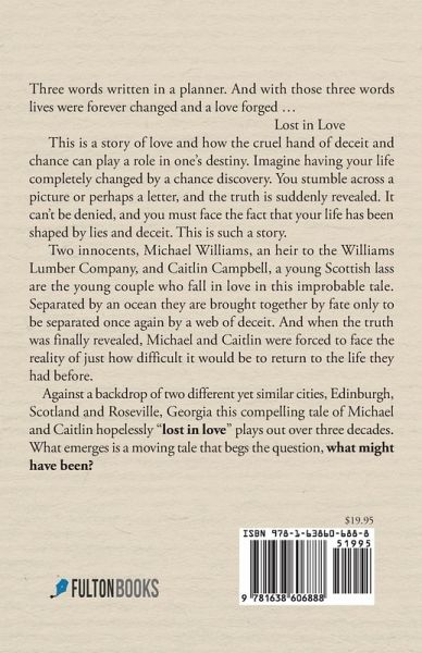 Three words written in a planner. And with those three words lives were forever changed and a love forged ... Lost in Love This is a story of love and how the cruel hand of deceit and chance can play a role in one's destiny. Imagine having your life completely changed by a chance discovery. You stumble across a picture or perhaps a letter, and the truth is suddenly revealed. It can't be denied, and you must face the fact that your life has been shaped by lies and deceit. This is such a story. Two innocents, Michael Williams, an heir to the Williams Lumber Company, and Caitlin Campbell, a young Scottish lass are the young couple who fall in love in this improbable tale. Separated by an ocean they are brought together by fate only to be separated once again by a web of deceit. And when the truth was finally revealed, Michael and Caitlin were forced to face the reality of just how difficult it would be to return to the life they had before. Against a backdrop of two different yet similar cities, Edinburgh, Scotland and Roseville, Georgia this compelling tale of Michael and Caitlin hopelessly "lost in love" plays out over three decades. What emerges is a moving tale that begs the question, what might have been?