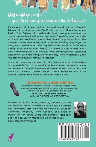 What would you do if your life turned upside down in a New York minute? Pink-slipped at 9 a.m. and hit by a drunk driver by midnight, 24-year-old aspiring actress, Eve Foster, moves to Manhattan where Pavlos (her 38-year-old boyfriend), lives. Just one problem: He doesn't remember inviting her. He's been forgetting a lot since the accident. And so, Eve arrives in New York City, ghosted. From the moment she touches down (with a broken wedding ring finger, no less), Eve's initiation into the City that Never Sleeps is more like a hazing. From the Fashion District to Chelsea to Central Park, Eve's efforts to make Manhattan her new home are fraught with upending encounters with the vanguard of the city. One in particular, the "Queen of Knitwear," may just break her. In a world drawn from Moreen Littrell's first six months of Manhattan in the mid-1990's, Lost in Manhattan is a riotous, cautionary tale - and roman à clef - of a wide-eyed heroine thrown into a "Sex and the City" universe. Unlike 'insider' Carrie Bradshaw, Eve Foster is an outsider. Eve doesn't know a Louboutin from a Choo.
