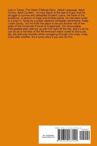 Lost in Texas: The Owen D'Monet Story (Adult Language, Adult Humor, Adult Content - it's very Adult) is the tale of a guy and his struggle to survive with defaulted Student Loans, the bane of his existence. In search of hope and kindred spirits, he has been lured to a town in Texas by a public relations campaign advertising "Keep Lostin Goofy," but he finds the place to be just another city in the grips of the Corporate Pursuit of Crappiness. His inexcusable, inescapable past catches up with him right off the bat, and it's all he can do as a member of the All-American reject crowd to find a job, job, job and stay homeful while navigating through one crisis, crisis, crisis after another. It's a funny story if you are not him.