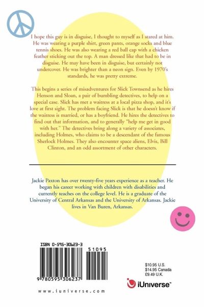 I hope this guy is in disguise, I thought to myself as I stared at him. He was wearing a purple shirt, green pants, orange socks and blue tennis shoes. He was also wearing a red ball cap with a chicken feather sticking out the top. A man dressed like that had to be in disguise. He may have been in disguise, but certainly not undercover. He was brighter than a neon sign. Even by 1970's standards, he was pretty extreme. This begins a series of misadventures for Slick Townsend as he hires Henson and Sloan, a pair of bumbling detectives, to help on a special case. Slick has met a waitress at a local pizza shop, and it's love at first sight. The problem facing Slick is that he doesn't know if the waitress is married, or has a boyfriend. He hires the detectives to find out that information, and to generally "help me get in good with her." The detectives bring along a variety of associates, including Holmes, who claims to be a descendant of the famous Sherlock Holmes. They also encounter space aliens, Elvis, Bill Clinton, and an odd assortment of other characters.