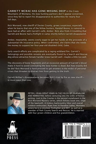 GARRETT MCRAE HAS GONE MISSING DEEP in the Crazy Mountains of Montana. His bow hunting partners don't appear concerned, since they fail to report his disappearance to authorities for nearly four full days. Rick Morrand, now sheriff of Dexter County, grows suspicious, especially when he learns that one of the fellow hunters, Randall Boone, is rumored to have had an affair with Garrett's wife, Amber. Rick also finds it troubling that Garrett and Boone had a fistfight in camp shortly before Garrett disappeared. Amber, meanwhile, seems overly eager to get her hands on the proceeds of a substantial life insurance policy. When confronted, she claims that she needs the money to support her four-year-old disabled child, Gabe. Early search efforts are complicated by a raging wildland fire. Garrett's belongings and possible remains are eventually found by a Search and Rescue dog whose attractive female handler knew Garrett well-maybe a little too well. The discovery of bone fragments and an excessive amount of Garrett's blood make it hard to avoid concluding the bow hunter is dead. But how exactly did he die? Rick Morrand is hard-pressed to get answers in the midst of personal crises that threaten to distract him from getting to the truth. Garrett McRae's disappearance becomes Rick's trial by fire as new sheriff-in more ways than one.