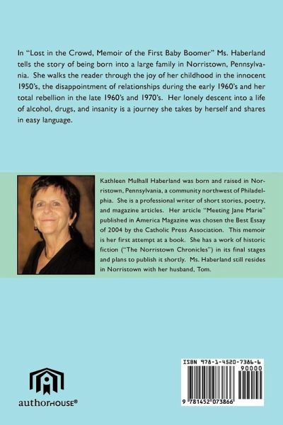 In "Lost in the Crowd, Memoir of the First Baby Boomer" Ms. Haberland tells the story of being born into a large family in Norristown, Pennsylvania. She walks the reader through the joy of her childhood in the innocent 1950's, the disappointment of relationships during the early 1960's and her total rebellion in the late 1960's and 1970's. Her lonely descent into a life of alcohol, drugs, and insanity is a journey she takes by herself and shares in easy language.