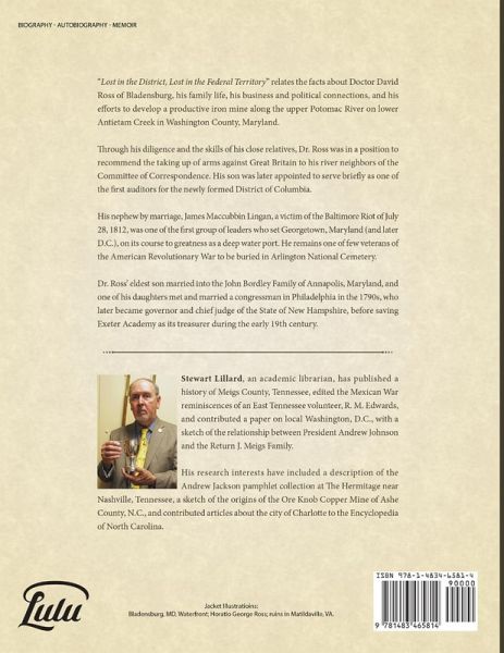 "Lost in the District, Lost in the Federal Territory" relates the facts about Doctor David Ross of Bladensburg, his family life, his business and political connections, and his efforts to develop a productive iron mine along the upper Potomac River on lower Antietam Creek in Washington County, Maryland. Through his diligence and the skills of his close relatives, Dr. Ross was in a position to recommend the taking up of arms against Great Britain to his river neighbors of the Committee of Correspondence. His son was later appointed to serve briefly as one of the first auditors for the newly formed District of Columbia. His nephew by marriage, James Maccubbin Lingan, a victim of the Baltimore Riot of July 28, 1812, was one of the first group of leaders who set Georgetown, Maryland (and later D.C.), on its course to greatness as a deep water port. He remains the only veteran of the American Revolutionary War to be buried in Arlington National Cemetery.