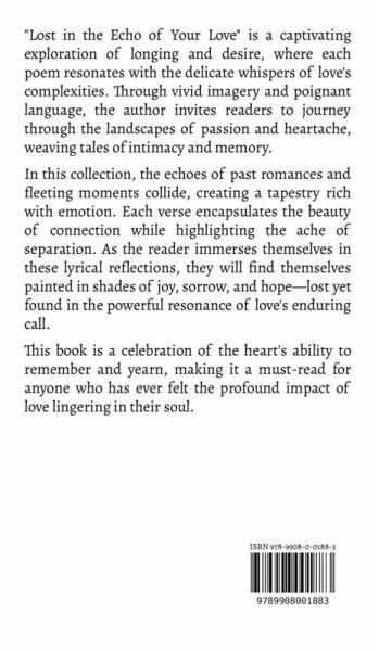 "Lost in the Echo of Your Love" is a captivating exploration of longing and desire, where each poem resonates with the delicate whispers of love's complexities. Through vivid imagery and poignant language, the author invites readers to journey through the landscapes of passion and heartache, weaving tales of intimacy and memory. In this collection, the echoes of past romances and fleeting moments collide, creating a tapestry rich with emotion. Each verse encapsulates the beauty of connection while highlighting the ache of separation. As the reader immerses themselves in these lyrical reflections, they will find themselves painted in shades of joy, sorrow, and hope-lost yet found in the powerful resonance of love's enduring call. This book is a celebration of the heart's ability to remember and yearn, making it a must-read for anyone who has ever felt the profound impact of love lingering in their soul.