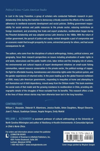 Presenting case studies by anthropologists, historians, political scientists, and environmental specialists,Lost in the Long Transition critically examines the impact of neoliberal economic and social policies at the local level in post-dictatorship Chile. Topics include privatization of water rights, tuberculosis and public health crises, the role of labor unions, industrial salmon farming, natural resource conservation, the political ecology of copper, struggles for affordable housing, homelessness and citizenship rights, and gender identity issues in the experiences of returned exiles.