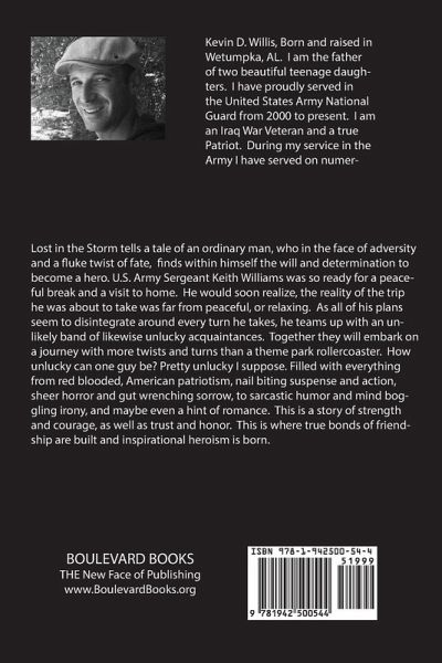Lost in the Storm tells a tale of an ordinary man, who in the face of adversity and a fluke twist of fate, finds within himself the will and determination to become a hero. U.S. Army Sergeant Keith Williams was so ready for a peace-ful break and a visit to home. He would soon realize, the reality of the trip he was about to take was far from peaceful, or relaxing. As all of his plans seem to disintegrate around every turn he takes, he teams up with an un-likely band of likewise unlucky acquaintances. Together they will embark on a journey with more twists and turns than a theme park rollercoaster. How unlucky can one guy be? Pretty unlucky I suppose. Filled with everything from red blooded, American patriotism, nail biting suspense and action, sheer horror and gut wrenching sorrow, to sarcastic humor and mind bog-gling irony, and maybe even a hint of romance. This is a story of strength and courage, as well as trust and honor. This is where true bonds of friend-ship are built and inspirational heroism is born.