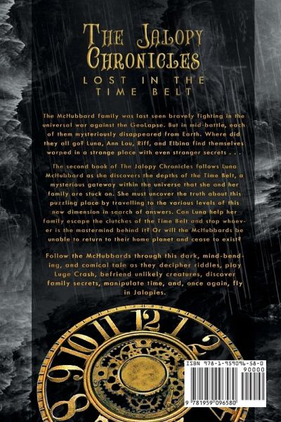 The McHubbard family was last seen bravely fighting in the universal war against the GeoLapse. But in mid-battle, each of them mysteriously disappeared from Earth. Where did they all go? Luna, Ann Lou, Riff, and Elbina find themselves warped in a strange place with even stranger secrets . . . The second book of The Jalopy Chronicles follows Luna McHubbard as she discovers the depths of the Time Belt, a mysterious gateway within the universe that she and her family are stuck on. She must uncover the truth about this puzzling place by travelling to the various levels of this new dimension in search of answers. Can Luna help her family escape the clutches of the Time Belt and stop whoever is the mastermind behind it? Or will the McHubbards be unable to return to their home planet and cease to exist? Follow the McHubbards through this dark, mind-bending, and comical tale as they decipher riddles, play Luge Crash, befriend unlikely creatures, discover family secrets, manipulate time, and, once again, fly in Jalopies.