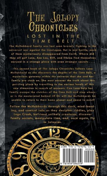 The McHubbard family was last seen bravely fighting in the universal war against the GeoLapse. But in mid-battle, each of them mysteriously disappeared from Earth. Where did they all go? Luna, Ann Lou, Riff, and Elbina find themselves warped in a strange place with even stranger secrets . . . The second book of The Jalopy Chronicles follows Luna McHubbard as she discovers the depths of the Time Belt, a mysterious gateway within the universe that she and her family are stuck on. She must uncover the truth about this puzzling place by travelling to the various levels of this new dimension in search of answers. Can Luna help her family escape the clutches of the Time Belt and stop whoever is the mastermind behind it? Or will the McHubbards be unable to return to their home planet and cease to exist? Follow the McHubbards through this dark, mind-bending, and comical tale as they decipher riddles, play Luge Crash, befriend unlikely creatures, discover family secrets, manipulate time, and, once again, fly in Jalopies.
