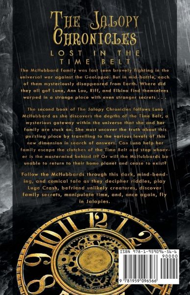 The McHubbard family was last seen bravely fighting in the universal war against the GeoLapse. But in mid-battle, each of them mysteriously disappeared from Earth. Where did they all go? Luna, Ann Lou, Riff, and Elbina find themselves warped in a strange place with even stranger secrets . . . The second book of The Jalopy Chronicles follows Luna McHubbard as she discovers the depths of the Time Belt, a mysterious gateway within the universe that she and her family are stuck on. She must uncover the truth about this puzzling place by travelling to the various levels of this new dimension in search of answers. Can Luna help her family escape the clutches of the Time Belt and stop whoever is the mastermind behind it? Or will the McHubbards be unable to return to their home planet and cease to exist? Follow the McHubbards through this dark, mind-bending, and comical tale as they decipher riddles, play Luge Crash, befriend unlikely creatures, discover family secrets, manipulate time, and, once again, fly in Jalopies.