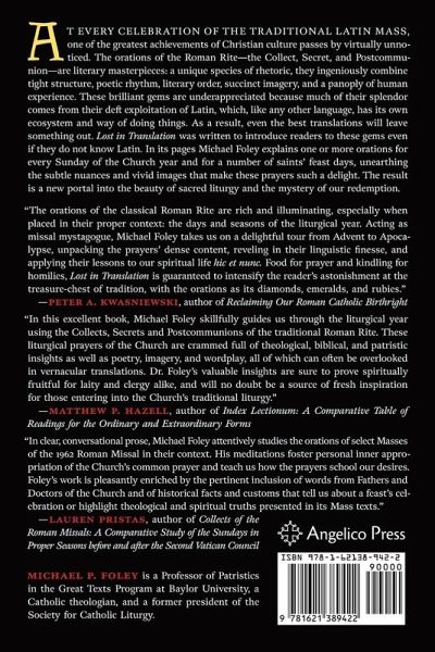 At every celebration of the traditional Latin Mass, one of the greatest achievements of Christian culture passes by virtually unnoticed. The orations of the Roman Rite-the Collect, Secret, and Postcommunion-are literary masterpieces: a unique species of rhetoric, they ingeniously combine tight structure, poetic rhythm, literary order, succinct imagery, and a panoply of human experience. These brilliant gems are underappreciated because much of their splendor comes from their deft exploitation of Latin, which, like any other language, has its own ecosystem and way of doing things. As a result, even the best translations will leave something out. Lost in Translation was written to introduce readers to these gems even if they do not know Latin. In its pages Michael Foley explains one or more orations for every Sunday of the Church year and for a number of saints' feast days, unearthing the subtle nuances and vivid images that make these prayers such a delight. The result is a new portal into the beauty of sacred liturgy and the mystery of our redemption.
