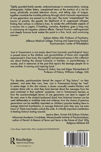 Introduction -- Shadows of the Holocaust -- Introduction -- The second generation in the shadow of terror -- The broken chain: legacies of trauma and war -- Traumatic shutdown of narrative and symbolization: a death instinct derivative? -- Clinical and historical perspectives on the intergenerational transmission of trauma -- Inside the Consulting Room -- Introduction -- The intertwining of the internal and external wars -- Treatment resistance and the transmission of trauma -- Turns of a phrase: traumatic learning through the generations -- Intergenerational violence and the family myth -- A quixotic approach to trauma and psychosis -- Contemporary America -- Introduction -- A mosaic of transmissions after trauma -- Heroes at home: the transmission of trauma in firefighters' families -- Afterword: lost and found