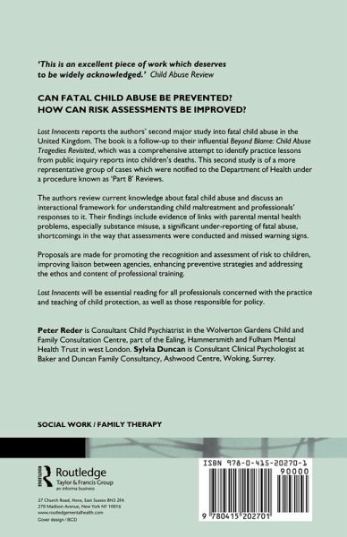 Lost Innocents is a follow-up to Beyond Blame: Child Abuse Tragedies Revisited (1993). In their new book, Peter Reder and Sylvia Duncan use the same process of case analysis and apply it to a more representative sample of cases. They describe the theoretical basis and method of the study and its findings, before going on to discuss their practical implications, and their opinions about the case review process itself. Finally, the authors discuss whether child abuse fatalities can be predicted or prevented.
