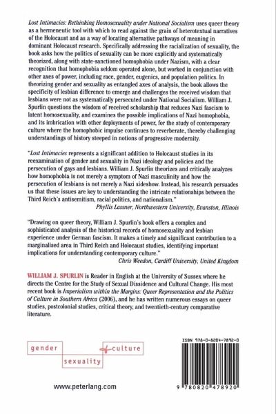 Lost Intimacies: Rethinking Homosexuality under National Socialism uses queer theory as a hermeneutic tool with which to read against the grain of heterotextual narratives of the Holocaust and as a way of locating alternative pathways of meaning in dominant Holocaust research. Specifically addressing the racialization of sexuality, the book asks how the politics of sexuality can be more explicitly and systematically theorized, along with state-sanctioned homophobia under Nazism, with a clear recognition that homophobia seldom operated alone, but worked in conjunction with other axes of power, including race, gender, eugenics, and population politics. In theorizing gender and sexuality as entangled axes of analysis, the book allows the specificity of lesbian difference to emerge and challenges the received wisdom that lesbians were not as systematically persecuted under National Socialism. William J. Spurlin questions the wisdom of received scholarship that reduces Nazi fascism tolatent homosexuality, and examines the possible implications of Nazi homophobia, and its imbrication with other deployments of power, for the study of contemporary culture where the homophobic impulse continues to reverberate, thereby challenging understandings of history steeped in notions of progressive modernity.