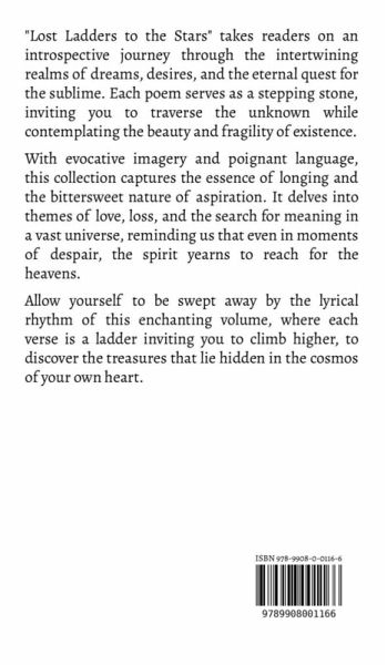 "Lost Ladders to the Stars" takes readers on an introspective journey through the intertwining realms of dreams, desires, and the eternal quest for the sublime. Each poem serves as a stepping stone, inviting you to traverse the unknown while contemplating the beauty and fragility of existence. With evocative imagery and poignant language, this collection captures the essence of longing and the bittersweet nature of aspiration. It delves into themes of love, loss, and the search for meaning in a vast universe, reminding us that even in moments of despair, the spirit yearns to reach for the heavens. Allow yourself to be swept away by the lyrical rhythm of this enchanting volume, where each verse is a ladder inviting you to climb higher, to discover the treasures that lie hidden in the cosmos of your own heart.