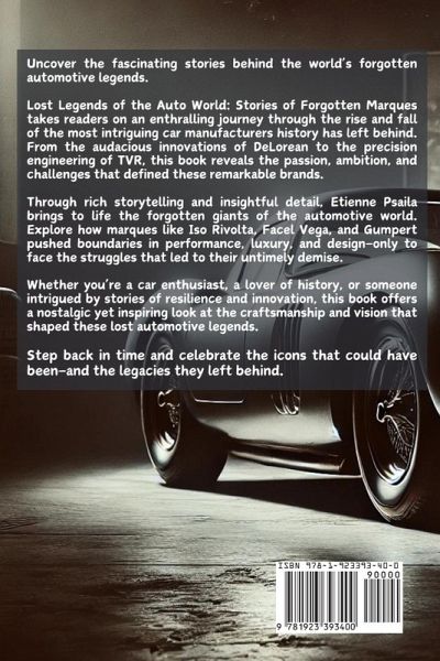 Uncover the fascinating stories behind the world's forgotten automotive legends. Lost Legends of the Auto World: Stories of Forgotten Marques takes readers on an enthralling journey through the rise and fall of the most intriguing car manufacturers history has left behind. From the audacious innovations of DeLorean to the precision engineering of TVR, this book reveals the passion, ambition, and challenges that defined these remarkable brands. Through rich storytelling and insightful detail, Etienne Psaila brings to life the forgotten giants of the automotive world. Explore how marques like Iso Rivolta, Facel Vega, and Gumpert pushed boundaries in performance, luxury, and design-only to face the struggles that led to their untimely demise. Whether you're a car enthusiast, a lover of history, or someone intrigued by stories of resilience and innovation, this book offers a nostalgic yet inspiring look at the craftsmanship and vision that shaped these lost automotive legends. Step back in time and celebrate the icons that could have been-and the legacies they left behind.