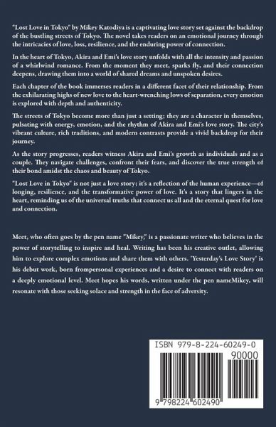 "Lost Love in Tokyo" by Mikey Katodiya is a captivating love story set against the backdrop of the bustling streets of Tokyo. The novel takes readers on an emotional journey through the intricacies of love, loss, resilience, and the enduring power of connection. In the heart of Tokyo, Akira and Emi's love story unfolds with all the intensity and passion of a whirlwind romance. From the moment they meet, sparks fly, and their connection deepens, drawing them into a world of shared dreams and unspoken desires. Each chapter of the book immerses readers in a different facet of their relationship. From the exhilarating highs of new love to the heart-wrenching lows of separation, every emotion is explored with depth and authenticity. The streets of Tokyo become more than just a setting; they are a character in themselves, pulsating with energy, emotion, and the rhythm of Akira and Emi's love story. The city's vibrant culture, rich traditions, and modern contrasts provide a vivid backdrop for their journey. As the story progresses, readers witness Akira and Emi's growth as individuals and as a couple. They navigate challenges, confront their fears, and discover the true strength of their bond amidst the chaos and beauty of Tokyo. "Lost Love in Tokyo" is not just a love story; it's a reflection of the human experience-of longing, resilience, and the transformative power of love. It's a story that lingers in the heart, reminding us of the universal truths that connect us all and the eternal quest for love and connection.