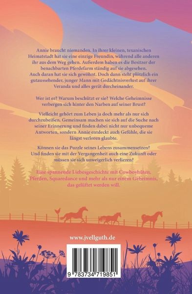 Annie braucht niemanden. In ihrer kleinen, texanischen Heimatstadt hat sie eine einzige Freundin, während alle anderen ihr aus dem Weg gehen. Außerdem haben es die Besitzer der benachbarten Pferdefarm ständig auf sie abgesehen. Auch daran hat sie sich gewöhnt.Doch dann steht plötzlich ein gutaussehender, junger Mann mit Gedächtnisverlust auf ihrer Veranda und alles gerät durcheinander.Wer ist er?Warum beschützt er sie?Welche Geheimnisse verbergen sich hinter den Narben auf seiner Brust?Vielleicht gehört zum Leben ja doch mehr als nur sich durchzubeißen.Gemeinsam machen sie sich auf die Suche nach seiner Erinnerung und finden dabei nicht nur unbequeme Antworten, sondern Annie entdeckt auch Gefühle, die sie längst verloren glaubte.Können sie das Puzzle seines Lebens zusammensetzen?Und finden sie mit der Vergangenheit auch eine Zukunft oder müssen sie sich unweigerlich verlieren?Eine spannende Liebesgeschichte mit Cowboyhüten, Pferden, Squaredance und mehr als nur einem Geheimnis, das gelüftet werden will.