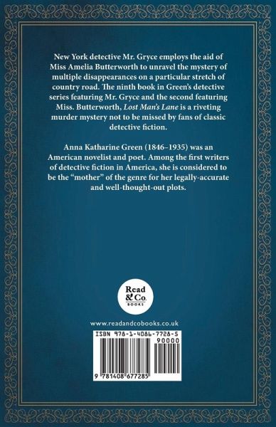 New York detective Mr. Gryce employs the aid of Miss Amelia Butterworth to unravel the mystery of multiple disappearances on a particular stretch of country road. The ninth book in Green's detective series featuring Mr. Gryce and the second featuring Miss. Butterworth, ¿Lost Man's Lane¿ is a riveting murder mystery not to be missed by fans of classic detective fiction. Anna Katharine Green (1846¿1935) was an American novelist and poet. Among the first writers of detective fiction in America, she is considered to be the ¿mother¿ of the genre for her legally-accurate and well-thought-out plots. Other notable works by this author include: ¿The Leavenworth Case¿ (1878), ¿A Strange Disappearance¿ (1880), and ¿The Circular Study¿ (1900). Read & Co. Classics is proudly republishing this vintage detective novel now in a brand new edition complete with a specially-commissioned new biography of the author.