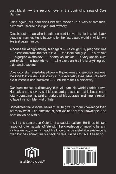 Lost Marsh ---- the second novel in the continuing saga of Cole Damon. Once again, our hero finds himself involved in a web of romance, adventure, hilarious intrigue and mystery. Cole is just a man who is quite content to live his life in a laid back peaceful manner. He is happy to let the fast paced world in which we live just pass him by. A house full of high energy teenagers ---- a delightfully pregnant wife ---- a cantankerous mother in law ---- the local bad guy ---- his ex wife ---- a gorgeous she-devil ---- a fanatical mayor ---- a very special aunt and uncle ---- a best friend ---- all make sure his life is anything but quiet and peaceful. Cole is constantly up to his elbows with problems and special situations, the kind that drives us all crazy in our everyday lives. Most of which are humorous and harmless ---- until he makes a discovery. Our hero makes a discovery that will turn his world upside down. He makes a discovery so hideous and gruesome, that it threatens to totally consume his sanity. It takes all his courage and inner strength to face this horrible twist of fate. Sometimes the lessons we learn in life give us more knowledge than we really want. The question is can we handle this knowledge, and what do we do with it. It is in this sense that Cole is of a special caliber. He finds himself responding to his twist of fate with the knowledge of knowing he is in a situation way over his head. He knows his peaceful little existence is over, but he cannot turn his back on fate. He has to face it head on.