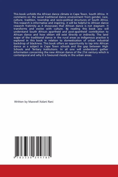 This book unfolds the African dance climate in Cape Town, South Africa. It comments on the social traditional dance environment from gender, race, culture, tradition, township and socio-political structures of South Africa. This research is informative and inspiring, it will be helpful to African dance research fratirnity as it showcases that African dance is not stagnant. It transforms and evolve with culture. By reading this book you will understand South Africa's apartheid and post-apartheid' contribution to African dance and how elitism still exist directly or indirectly. The land scape of the traditional dance in the rural areas as indigenous practice is explored in this book in relation to domestication of urban industrial backdrop of blackness. This book offers an opportunity to tap into African dance as a subject in Cape Town schools and the gap between High Schools and Tertiary institutions. In all one will understand gather information concerning the new African dance of the 21st century which is contemporal and why it is favoured mostly in the urban areas.