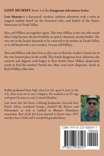 LOST MUMMY: Book 3 of the Dangerous Adventures Series After their harrowing journey in Bhutan, Max and Hillary should be able to handle anything, right? Wrong. When Hillary recklessly brings home an ancient Native American basket containing a unforgiving infant mummy, they find themselves drawn into the hostile heart of Death Valley on a cryptic quest. The mummified "wee one" issues a chilling ultimatum: return it to its ancestral burial grounds and mother or it will mystically bind itself to Hillary as its new mother. With the supernatural relic's power growing, Max and Hillary have no choice but to brave the scorching, unforgiving desert in a frantic search. But finding the burial site is just half the battle. Death Valley lives up to its name, throwing grueling challenges at the adventuring duo - from lethal heatwaves and precarious slot canyons, to terrifying rock slides and a devastating car crash. As their reality blurs with Native legends, Max's innate metaphysical sensitivity may be the key to survival. With their very souls at stake against the wee one's dark magic, can Max and Hillary endure the brutal elements and supernatural threats long enough to break the curse? Or will the desert's vast emptiness prove inescapable, even for them? In this latest book of the Dangerous Adventure Series, author Robby Robertson authentically transports readers into Death Valley's scorching dangers and haunting mystique. Inspired by his own extreme travels, Lost Mummy seamlessly fuses heart-pounding outdoor survival with real Native American lore. One thing's for certain: this is no ordinary hike. Max and Hillary are in for their most perilous adventure yet...