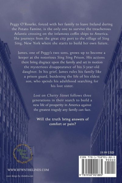 Peggy O'Rourke, forced with her family to leave Ireland during the Potato Famine, is the only one to survive the treacherous Atlantic crossing on the infamous coffin ships to America. She journeys from the great city port to the village of Sing Sing, New York where she starts to build her own future. James, one of Peggy's two sons, grows up to become a keeper at the notorious Sing Sing Prison. His actions there bring disgrace upon the family and set in motion the mysterious disappearance of his 5-year-old daughter. In his grief, James rules his family like a prison guard, burdening the life of his eldest son, who spends his adulthood searching for his lost sister. Lost on Cherry Street follows three generations in their search to build a new life of prosperity in America against the greatest tragedy any family can face. Will the truth bring answers of comfort or pain?