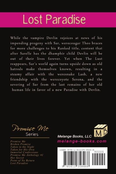 While the vampire Devlin rejoices at news of his impending progeny with Sar, werecougar Theo braces for more challenges to his Ranked title, content that after Sarelle has the dhamphir child Devlin will be out of their lives forever. Yet when The Lust reappears, Sar's world again turns upside down as old hatreds make themselves known, resulting in a steamy affair with the weresnake Lash, a new friendship with the werecoyote Serena, and the severing of Sar from the last remains of her old human life in favor of a new Paradise with Devlin.