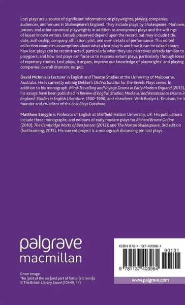 "The collection of thirteen essays ... seeks to redress the way in which such plays are categorised, identified, and discussed in order to improve scholarly knowledge of playwrights' and playing companies' overall dramatic output. ... this is a glorious volume that does justice to the burgeoning interest in so-called 'lost' plays ... . This volume will serve to partner any focussed look at specific lost plays, as well as the broader catalogues and databases published in recent years." (Natalie C. J. Aldred, SHARP News, sharpweb.org, August, 2016)