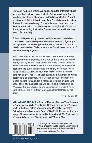 Stories in the Books of Genesis and Exodus tell of fathers whose sons are 'lost' to them through 'deaths' of various kinds. One is murdered. Another is abandoned. A third is supplanted. A fourth is betrayed. A fifth is taken for sacrifice. A sixth is forgotten about. A seventh is secreted away. Only one of these is lost through physical death; the others 'die' symbolically. But in their different ways all these sons are lost to their fathers, some for a time, some forever. And all of them develop the theme with which the biblical narrative begins: God's first son Adam who, by becoming 'lost' to his Creator, sets in train God's long search for humanity . . . The book culminates with a chapter on Jesus: God's son lost and found.