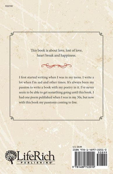 I first started writing when I was in my teens. I write a lot when I'm sad and other times. It's always been my passion to write a book with my poetry in it. I've never seem to be able to get something going until this book. I had one poem published when I was in my 30s, but now with this book my passionis coming to live.