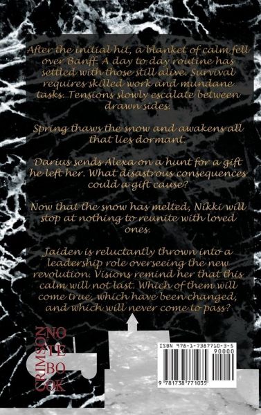 After the initial hit, a blanket of calm fell over Banff. A day to day routine has settled with those still alive. Survival requires skilled work and mundane tasks. Tensions slowly escalate between drawn sides. Spring thaws the snow and awakens all that lies dormant. Darius sends Alexa on a hunt for a gift he left her. What disastrous consequences could a gift cause? Now that the snow has melted, Nikki will stop at nothing to reunite with loved ones. Jaiden is reluctantly thrown into a leadership role overseeing the new revolution. Visions remind her that this calm will not last. Which of them will come true, which have been changed, and which will never come to pass?
