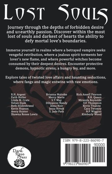 Journey through the depths of forbidden desire and unearthly passion. Discover within the most lost of souls and darkest of hearts the ability to defy mortal love's boundaries. Immerse yourself in realms where a betrayed vampire seeks vengeful retribution, where a jealous spirit torments her lover's new flame, and where powerful witches become consumed by their deepest desires. Encounter protective demons, hypnotic sirens, a hungry fey, and more. Explore tales of twisted love affairs and haunting seductions, where fangs and magic entwine with raw emotions. A Dark Paranormal Romance Anthology Featured Authors: Alma Noir Avery Hunter Beth Hildenbrand Brianna Malotke Cara Twomey Dibyasree Nandy Faith Butler Jessa Novak Kevin Hopson Kimberly Wood Kyvin Titanite Linda M. Crate Mercy Marie Miranda Reynolds N.P. Wiggins R.H. Argent R.R. Queen Rick A. Pearson S. Jade Path S.T. May Shawna Renee Lewis V.F. Thompson Velian Dusk